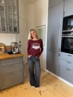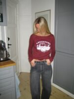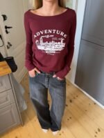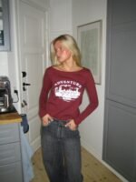 A statement long-sleeved T-shirt in a bold red shade. The design features a classic round neckline and a cool print with white lettering. adding a modern and sporty touch. The relaxed fit makes it perfect for both casual outfits and streetwear-inspired looks. Style it with jeans or sweatpants for an effortless. cool expression.
