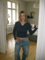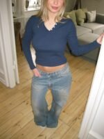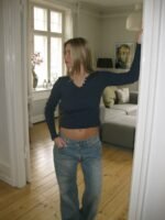 An elegant and versatile long-sleeved top in a deep navy shade. The ribbed fabric ensures a flattering. form-fitting silhouette. while the round neckline and three buttons at the bust add a classic and feminine touch. The embroidered details provide an exclusive finish. perfect for both everyday wear and more polished looks. Style it with jeans for a casual outfit or layer it under a blazer for a sophisticated expression.