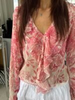 Long-sleeved blouse with v-neckline and floral print. The top has a loose and comfortable fit.